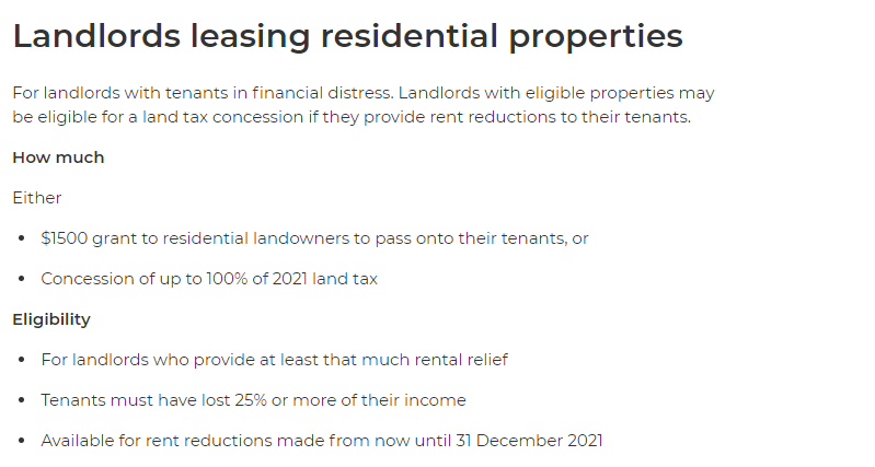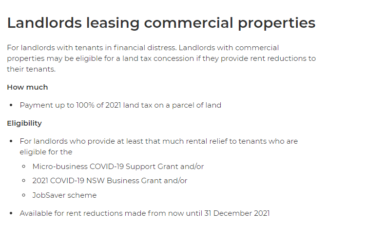 如果房东愿意为陷入经济困难的商业租户(能满足以下任一一种企业补助条件:Micro-business COVID-19 Support Grant /2021 COVID-19 NSW Business Grant /JobSaver scheme)减租且承诺减租可以持续到2021年12月31日的话,那么新州政府将提供2021年其地块土地税的优惠(最高可达100%优惠)。